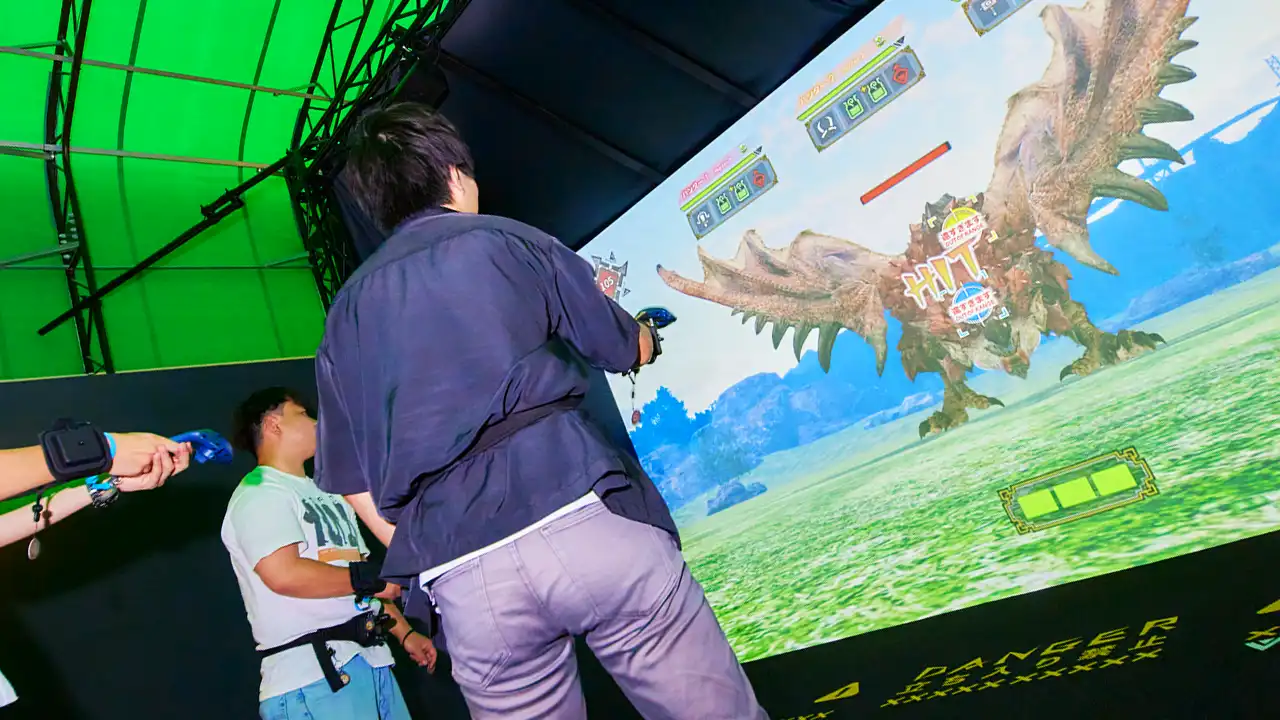 大型モンスターとは専用の討伐ルームで、武器コントローラーとトラッキングベルトを着用して、実際に腕を振ってモンスターへ攻撃したり、モンスターの攻撃を避けて討伐成功を目指します。