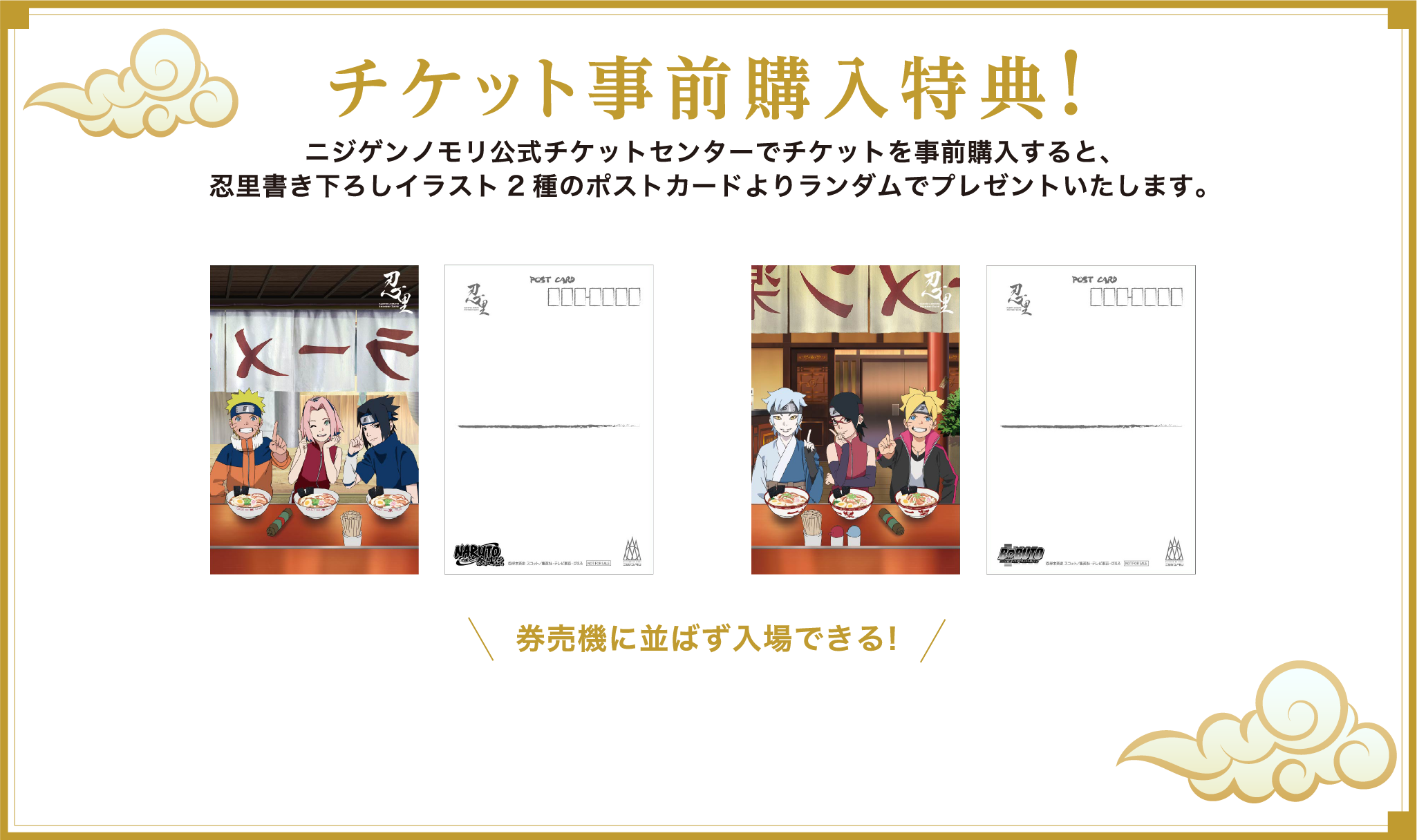 NARUTO×BORUTO忍里エリア内の巻物お渡し所で謎解きキットを受け取ろう!前売りチケットを購入された方は、スタッフにQRコードを提示してください。
